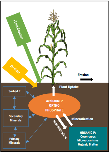 Second, phosphorous can cycle through several chemical forms, most of which are not available for plant uptake (figure 1). Ortho-phosphorus is the chemical form that is plant-available. For example, orthophosphorus interacts with aluminum or calcium to form insoluble minerals and is converted to an organic form when used by living organisms (lower right figure 1). Other soil microorganisms produce specific enzymes can once again make these nutrients available for plant uptake. Similar to mycorrhizae fungi, these microorganisms likely require living plants for part or all of their life cycle, though the connection might not be direct and physical.