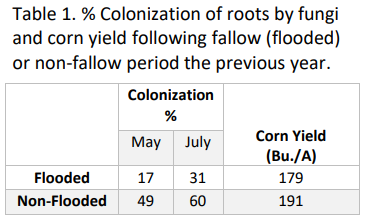 by living plants. In turn, nutrients are not being cycled because of low or slow microbial populations. Crops planted the following year face a 2-pronged, uphill battle to obtain nutrients: 1. There are few mycorrizae to help scavenge the soil for available nutrients. 2. The nutrient cycle is moving very slowly. The effect is lower crop yield after a fallow period. Losses in corn have been documented between 7-32 bu/acre the year after a fallow (Table 1 remade from Ellis 2013, Journal of Production Agriculture).
