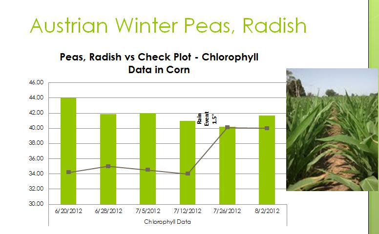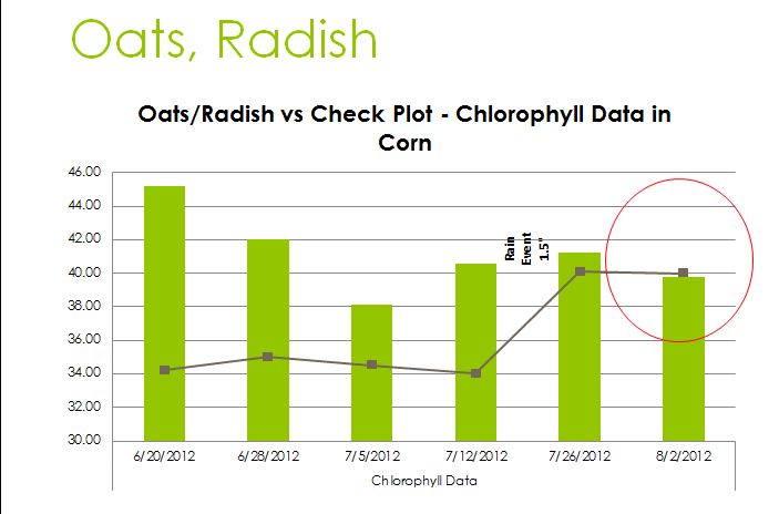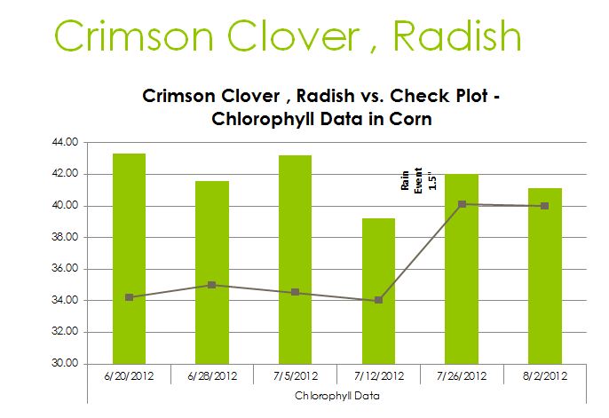 Let’s investigate the difference between adding a legume to a cover crop mix following soybeans compared to planting scavengers only. The charts are from our family farm trials. The charts show the chlorophyll readings of the corn in the year following the soybeans (and then following a cover crop).