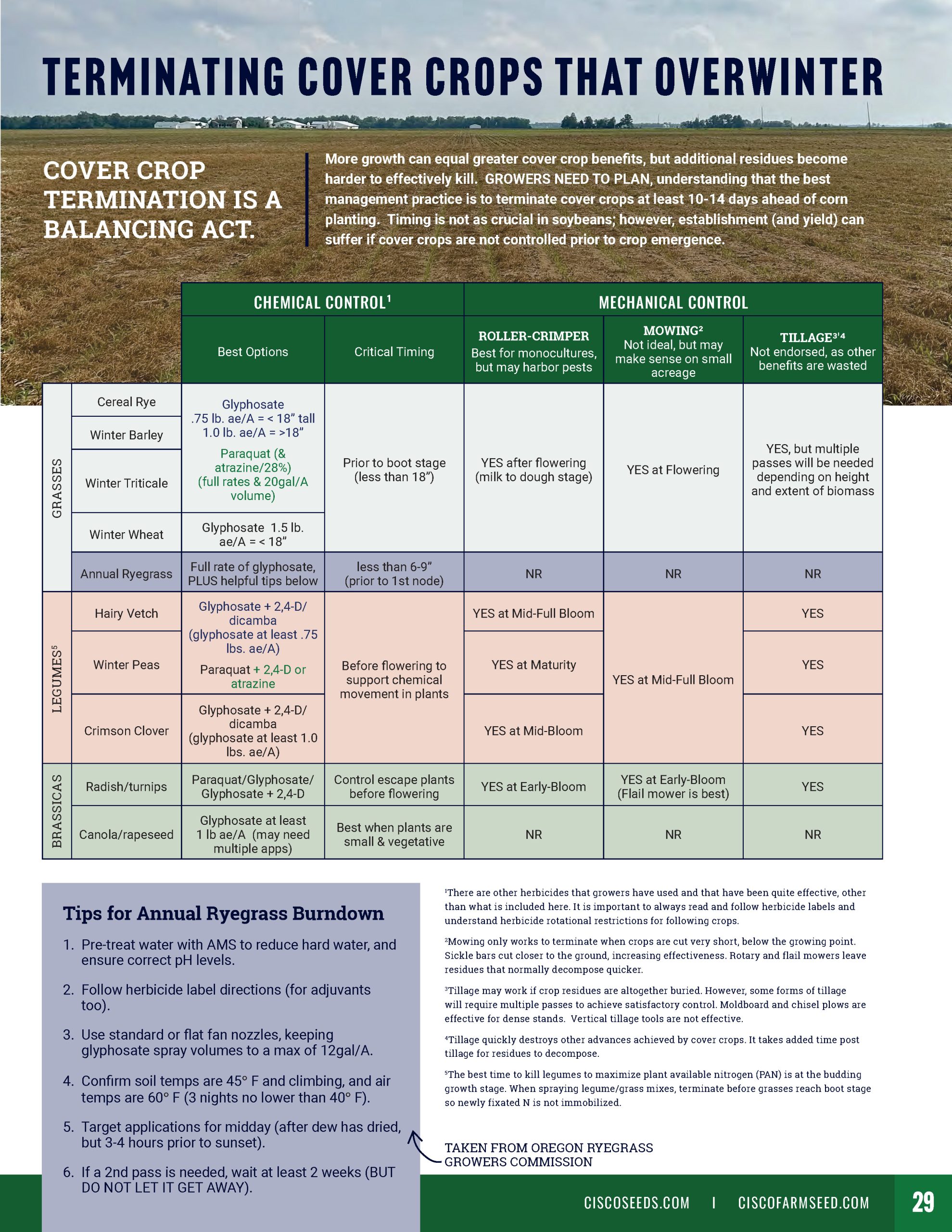 - WATCH OUT – beware of annual ryegrass blends, or common and/or VNS lots of annual ryegrass – they may not have the winterhardiness needed nor have uniform maturity, which is so critical for successful spring management (see “Tips for Annual Ryegrass Burndown” below)