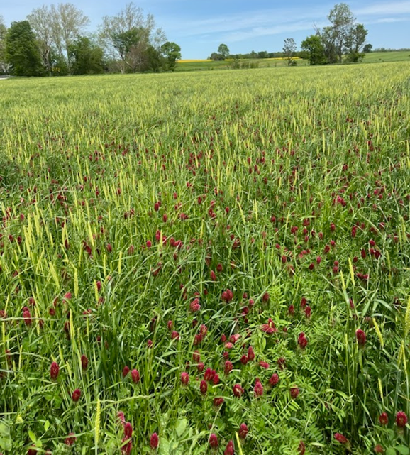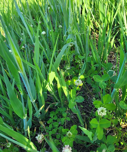These pictures are from the field I frost-seeded into growing winter wheat on March 17, 2023, at 15 lbs per acre. We clipped it for weed control in July and harvested it for hay in September 2023.