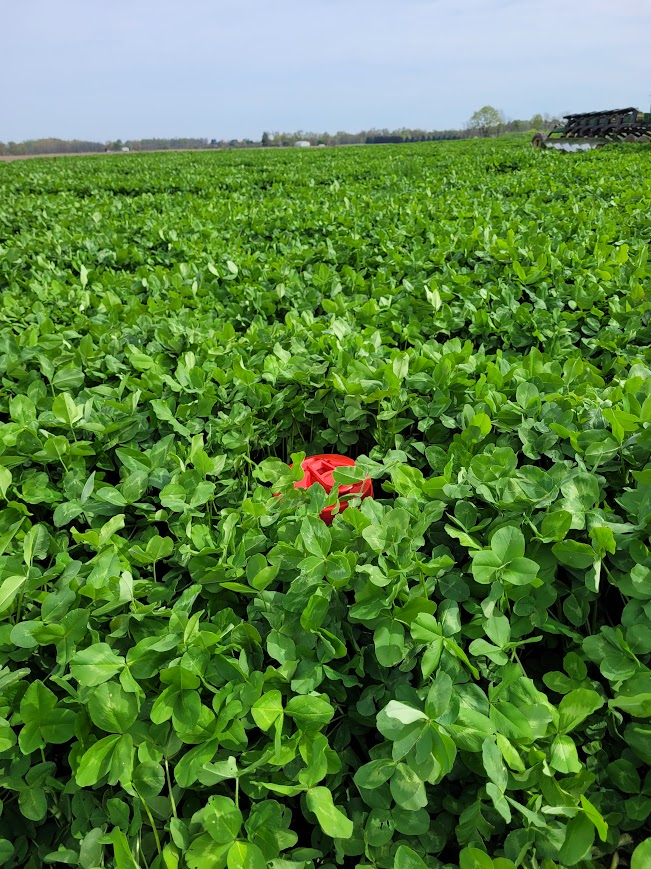 Red clover frost-seeded into winter wheat 14 months ago grew very well in early spring. It broke dormancy quicker and yielded better than any other clover species I tried. The pace of red clover growth may have been slower than balansa on the date of termination, but the red clover had enough of an earlier start that it had about 30% more biomass at termination. Medium red was also the top choice for suppressing weeds after wheat harvest.