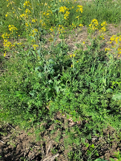 This cover crop was seeded after a period of mechanical fallow following an organic wheat crop in September 2023. It was a diverse mix with ingredients that both winterkilled and overwintered. The overwintering ingredients were volunteer wheat, hairy vetch, berseem clover, and Bayou kale.