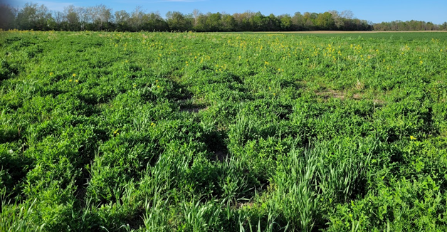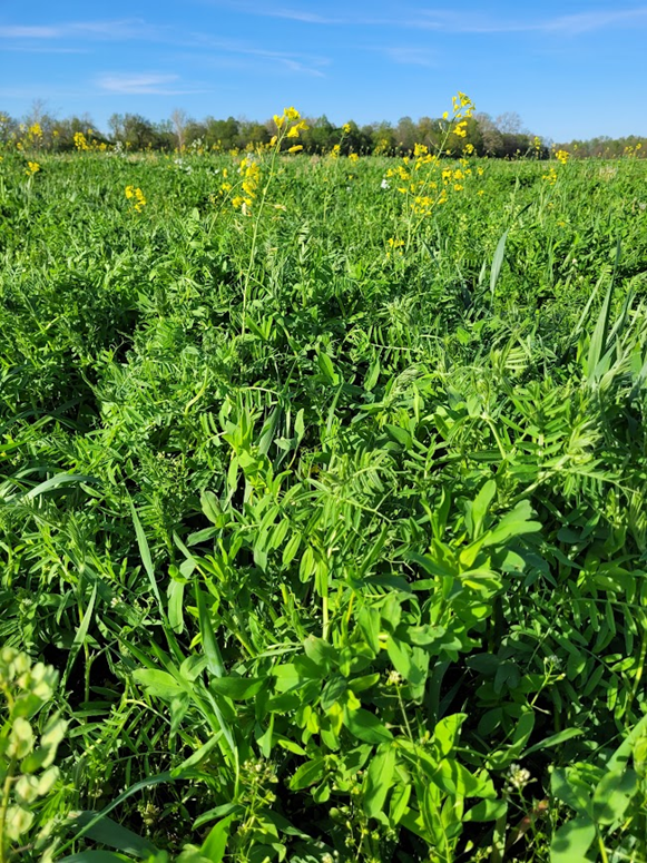 I planted legume-containing cover crops after our earliest soybean variety last fall. Most were seeded during the first week of October 2023. The base of these mixes was Valor barley and Pategonia hairy vetch. The barley turned out thicker than I had planned. I think every seed grew, survived the winter, and tillered!