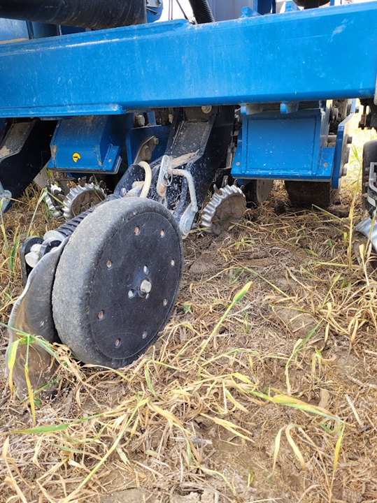 Closing the seed trench can be tricky in no-till with cover crops. I like to run 1 spiked closing wheel paired with 1 rubber tire. This gives aggressive closing action with depth control provided by the rubber tire. While I am a fan of good down pressure in the front of the planter, I don’t like it on the closing wheels. I very rarely run anything but the lowest two settings. Success to me is a clean seed row, with a crumbly, fully closed seed trench. The very best no-till has the seed thinking it’s in tilled soil and tractor driving like it’s on sod.